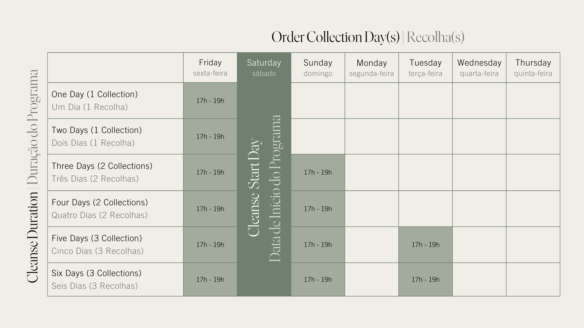 Cleanse programmes can start on a Monday, Wednesday or a Saturday. You can collect from our production facility in Oeiras between 5pm and 7pm on the evening before your cleanse start date and every two days throughout the programme, without incurring delivery fees.